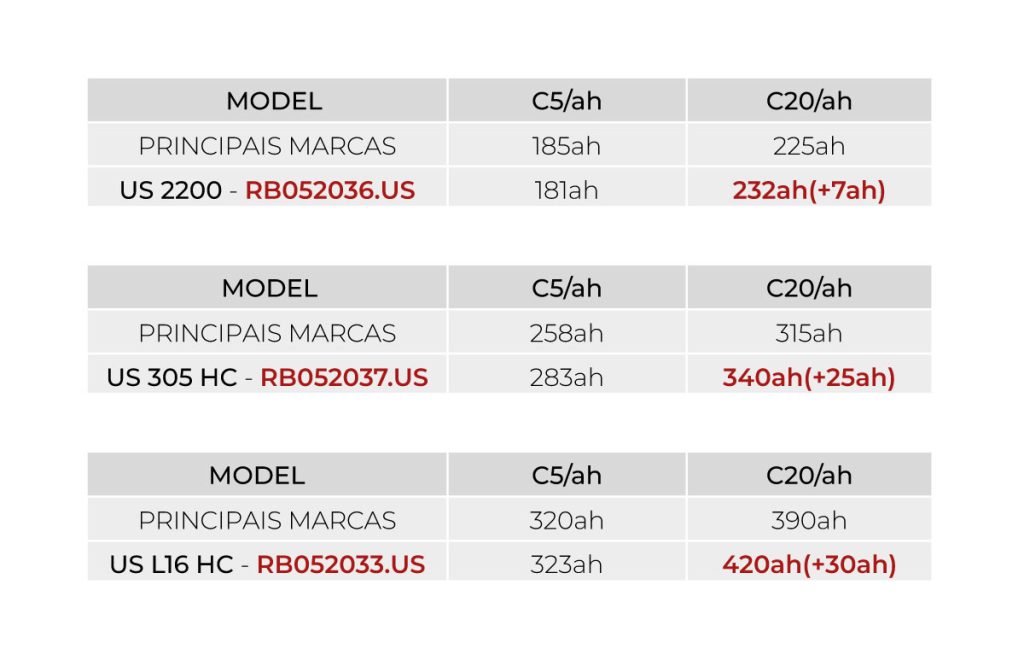 Os resultados falam por si. Comparadas a outras baterias equivalentes do mercado, as US Battery oferecem maior capacidade em C20, descargas mais estáveis e uma vida útil superior.